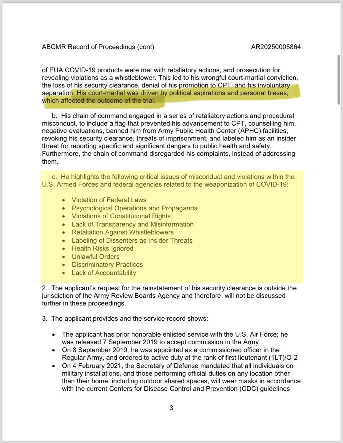 This triumph reflects divine orchestration, the prayers of thousands, and steadfast allies. My deepest gratitude goes to President Donald J. Trump and Honorable Pete Hegseth for their leadership; Honorable Earl Matthews, Honorable Anthony Tata, Stu Scheller, David Willson Davis Younts, Kacy Dixon, JJ McAfee, Senator Ron Johnson’s Office, Dr. Lee Vliet at the Truth for Health Foundation, Plandemic Reprimandos, and my Senior Enlisted Advisors; and above all, my wife, children, family, and friends for their unwavering love.